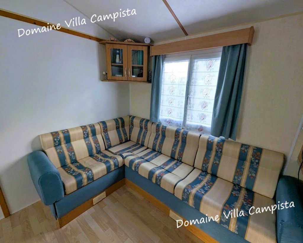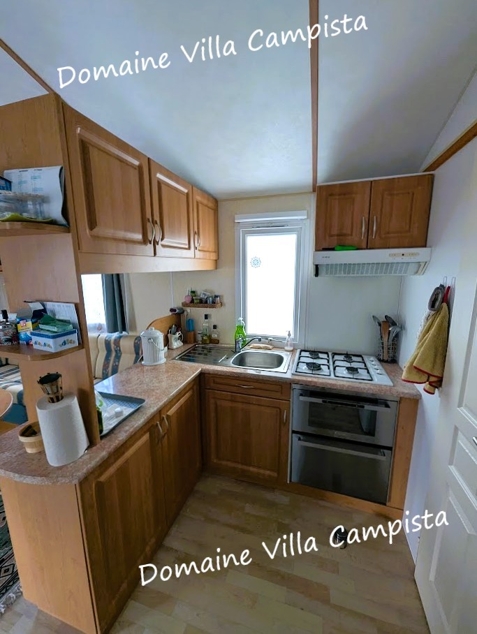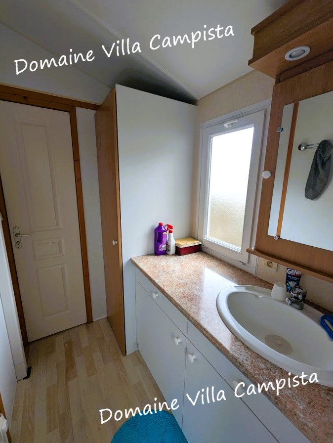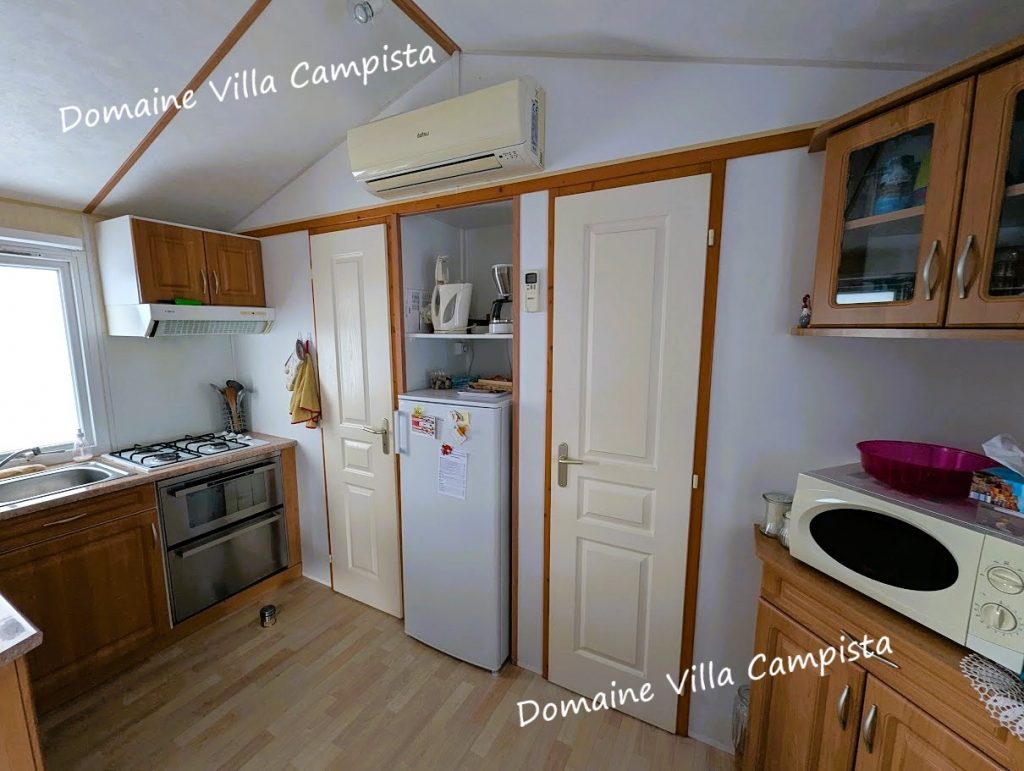 Mobil-home RIDOREV Eldorado, 9,00 x 3,70 m, année 2004, 2 chambres avec fenêtres équipées de volets battants : 1 chambre parentale avec lit double et prise TV, 1 chambre avec lits superposés + lit simple.